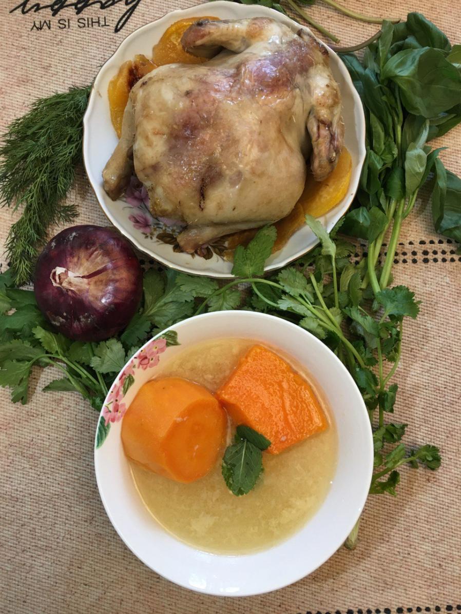 Суп с тыквой, бататом плюс запеченный на подложке из ломтиков репы с румяным цыпленком.