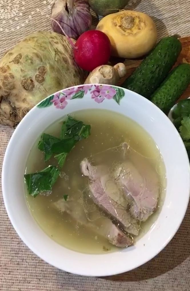 Сборный насыщенный суп из индейки, мозговой говяжьей косточки и сельдерея.