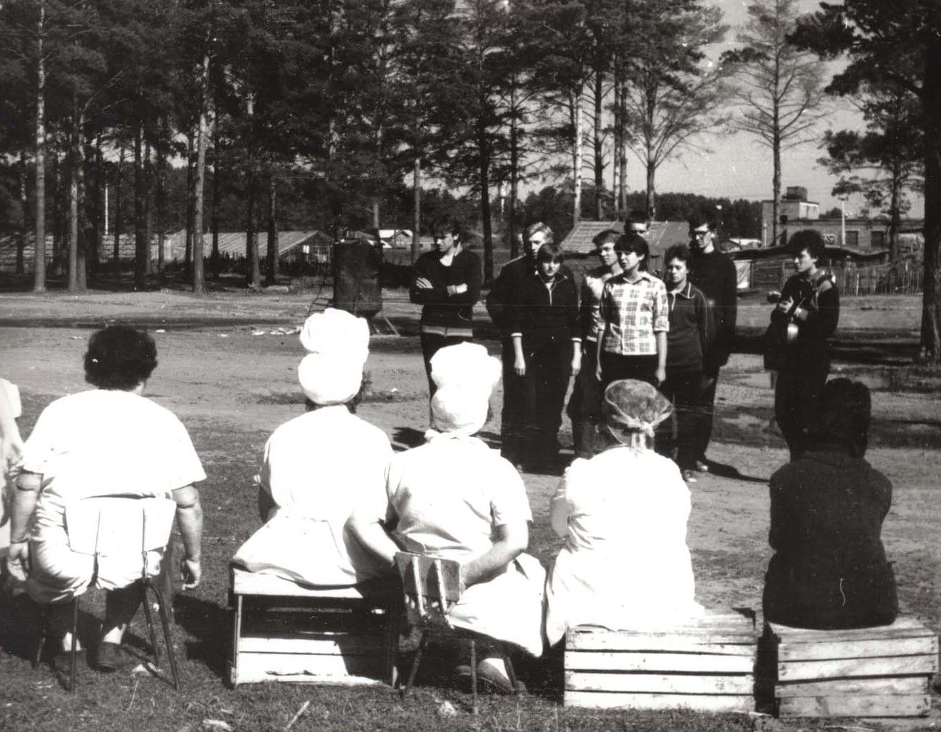Картина была очень живописной: невдалеке шлепали гуси по лужам, мотался теленок. Повара, рассевшись на скамейках, слушали песни, смеялись над сценками из студенческой жизни. Выступала агитбригада лагеря.