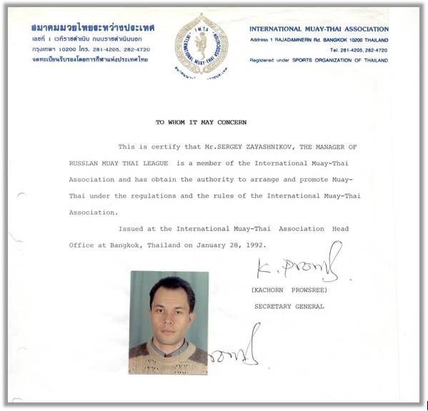 14 декабря 1992 г. делегация РЛМТ выехала по приглашению в Бангкок, где на стадионе «Раджадамнын Боксинг» состоялась историческая встреча с ведущими промоутерами Таиланда, и РЛМТ стала членом Международной организации IMTA (штаб-квартира в Бангкоке, Таиланд). См. стр. 311