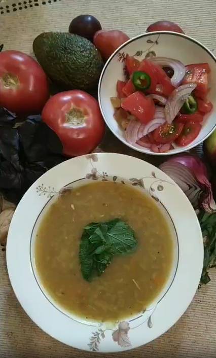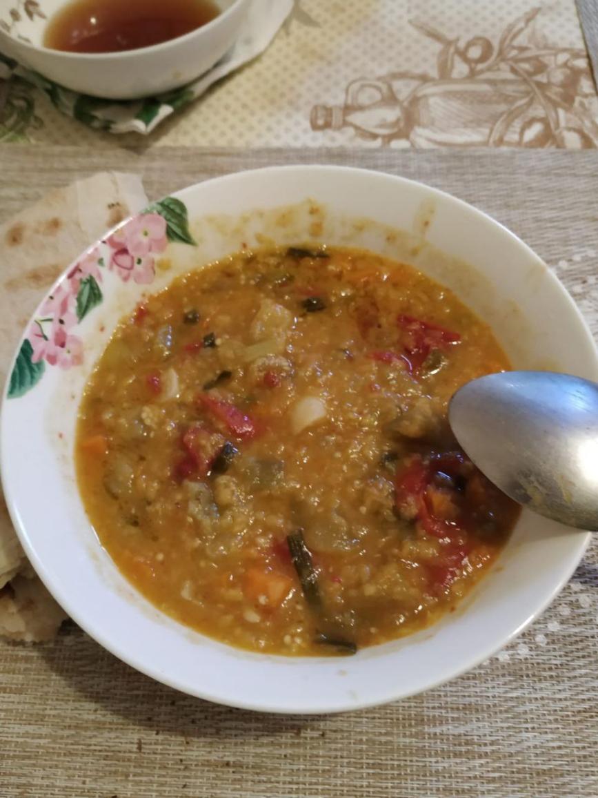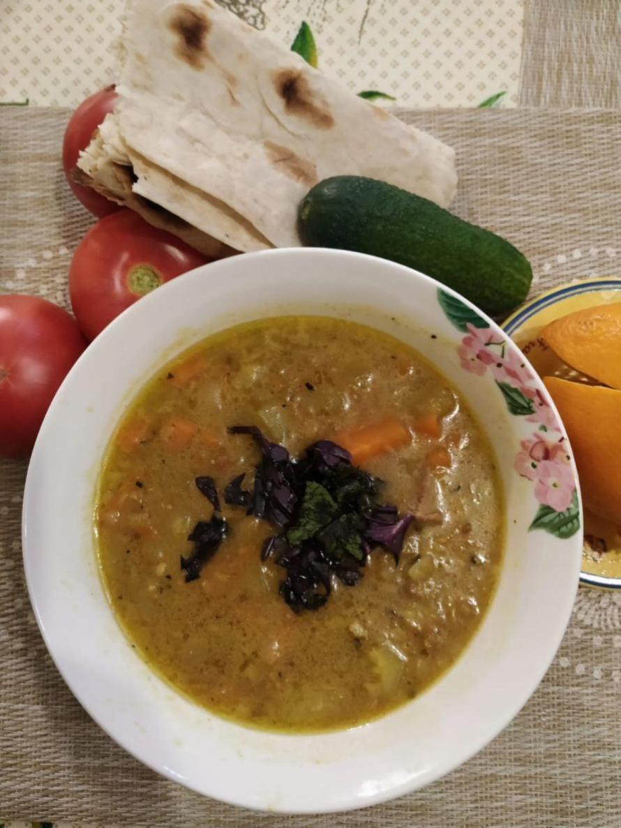 Шурпа с бараниной, красной чечевицей, тархуном.