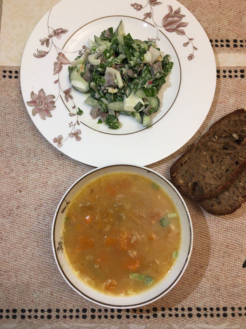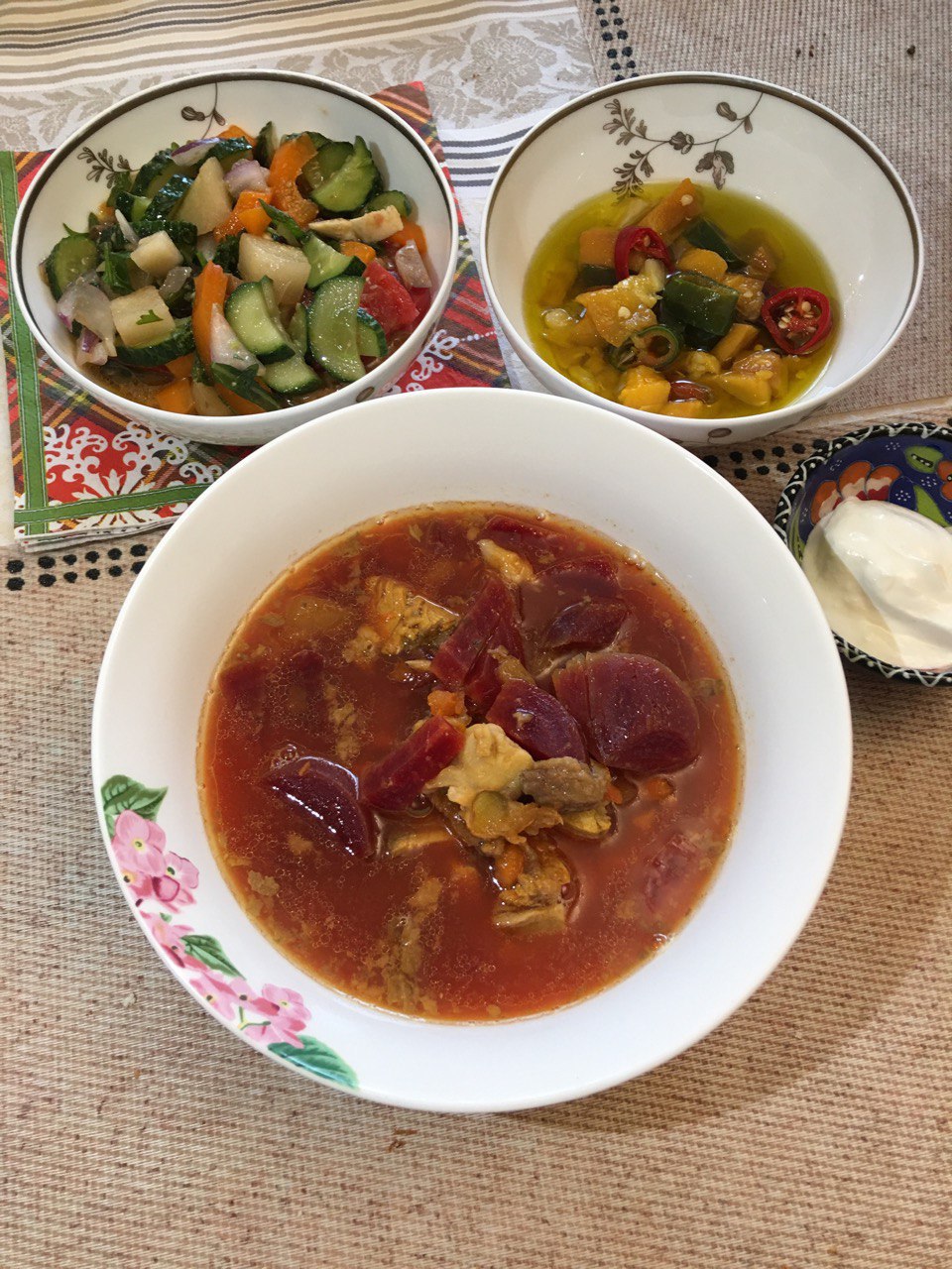 Борщ с индейкой, чесноком и сметаной, салат и солнечный остро-сладкий соус