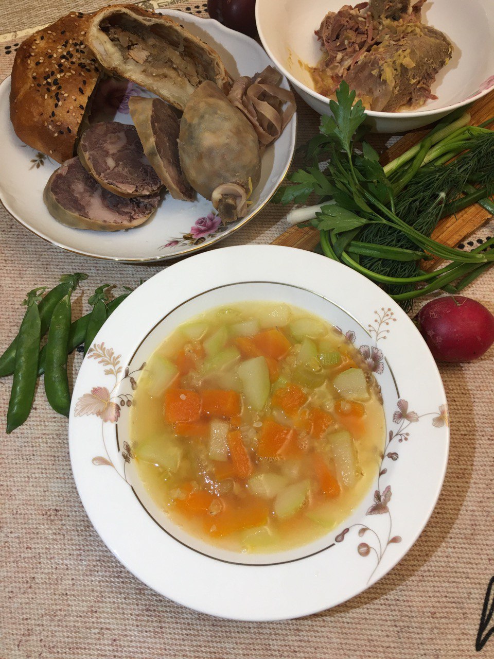 Суп из оссобуко и овощей (тыква, кабачок, репа)