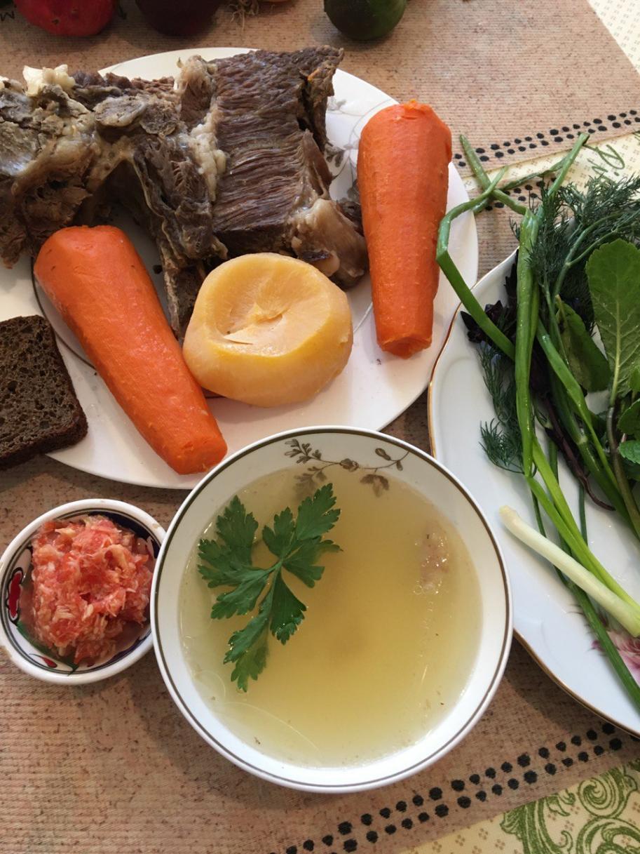 При подаче огненного бульона, положить рядом зелень и подсолить,также поступить и с выложенными на тарелку куском мяса и овощами. Хренодер! Прямо в тему!