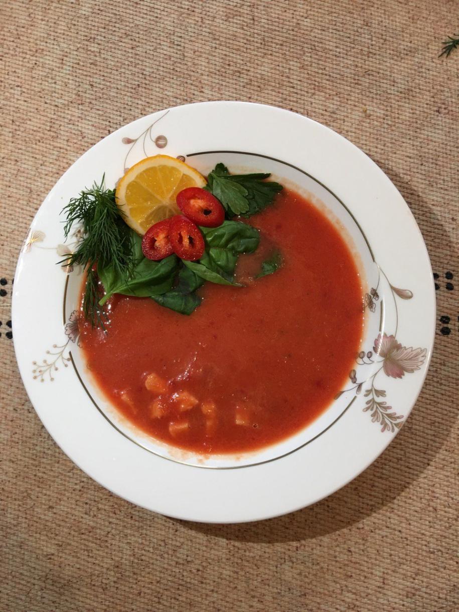 5. При подаче в тарелку добавить мелко нарубленную зелень тархуна и кинзы. Добавить к супу салат с помидорами, моцареллой, авокадо и рукколой.