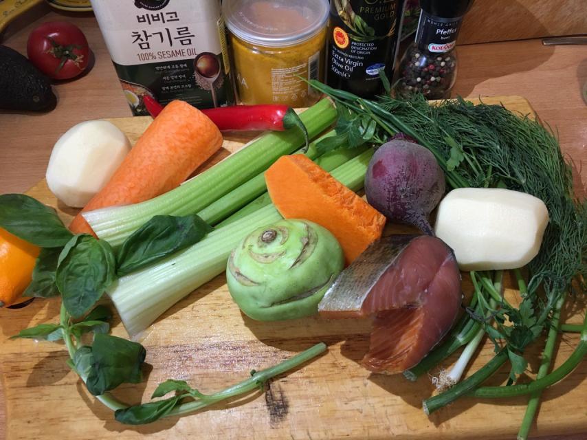 Бульон – свекла, тыква, морковь, кольраби, картофель, лук.