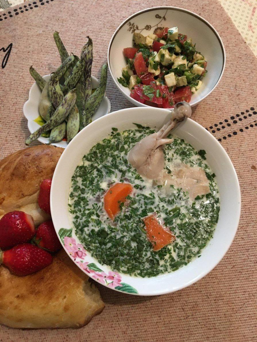 При подаче положить в тарелку мелко нарубленную зелень кинзы и мяты.