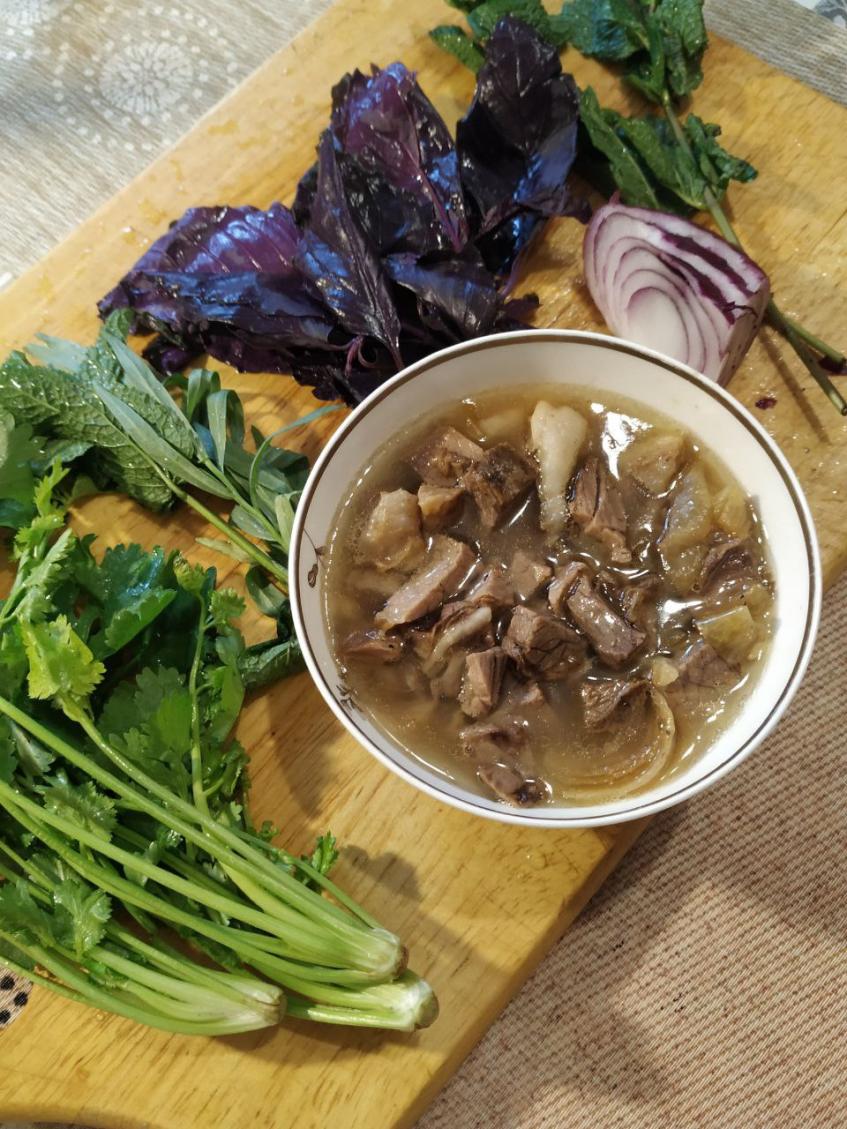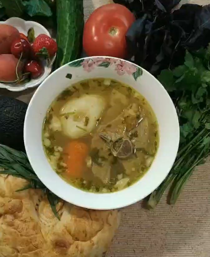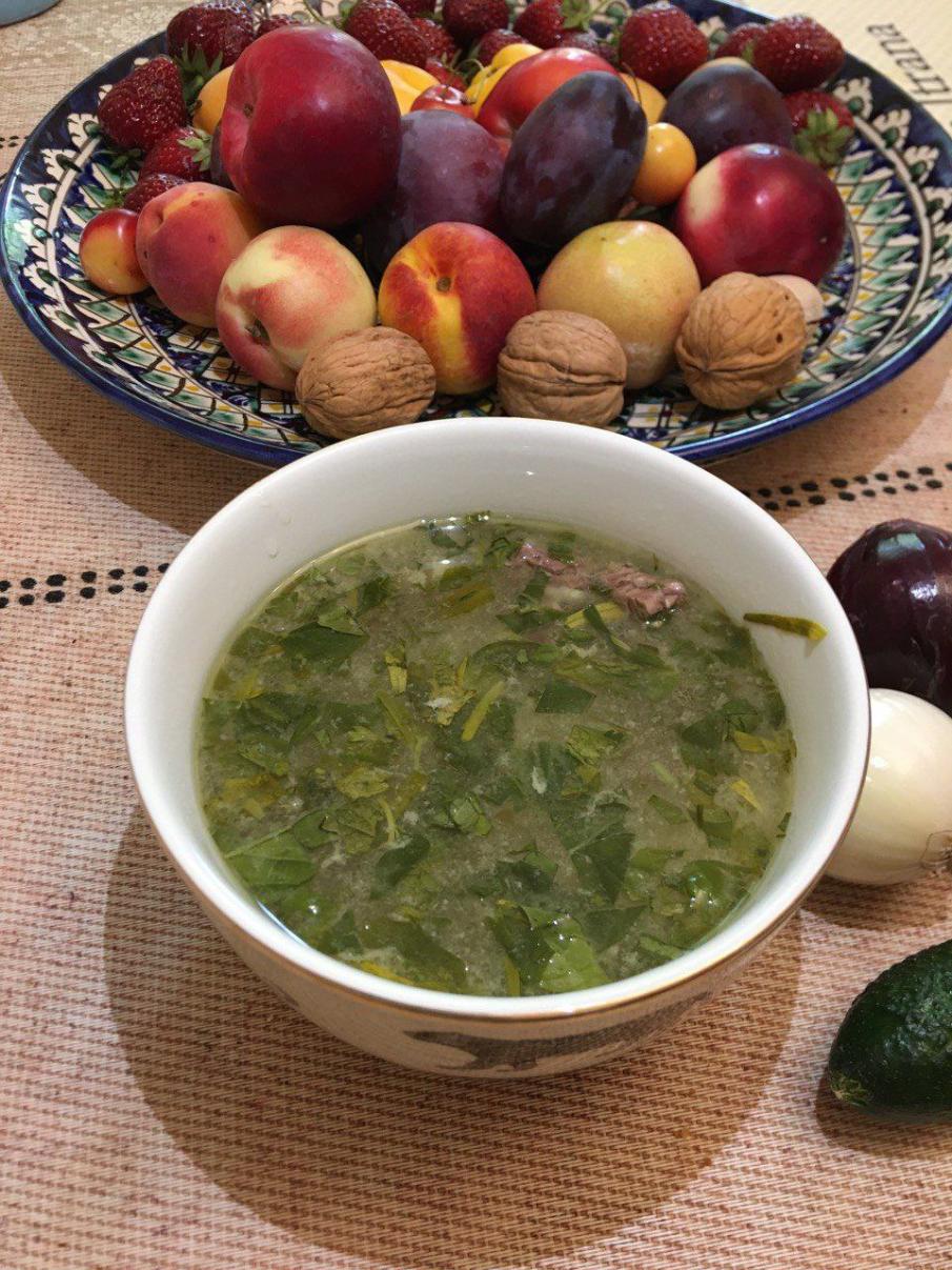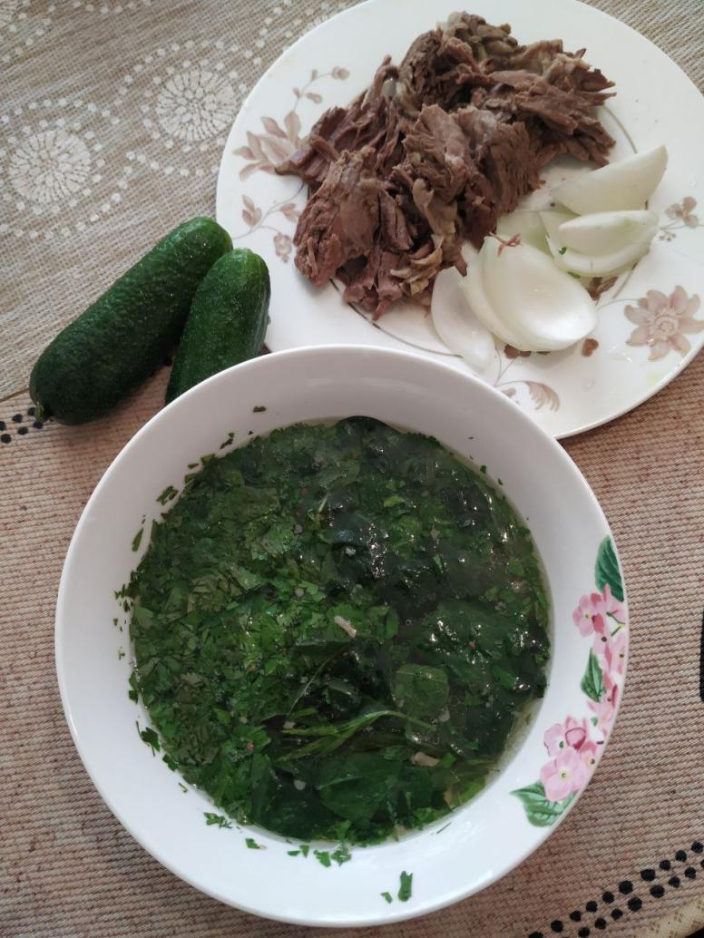 Летний суп на бульоне из казылыка с бурым рисом, травами (зеленый базилик, мята, тархун, кинза) и кусочками запечённой говядины