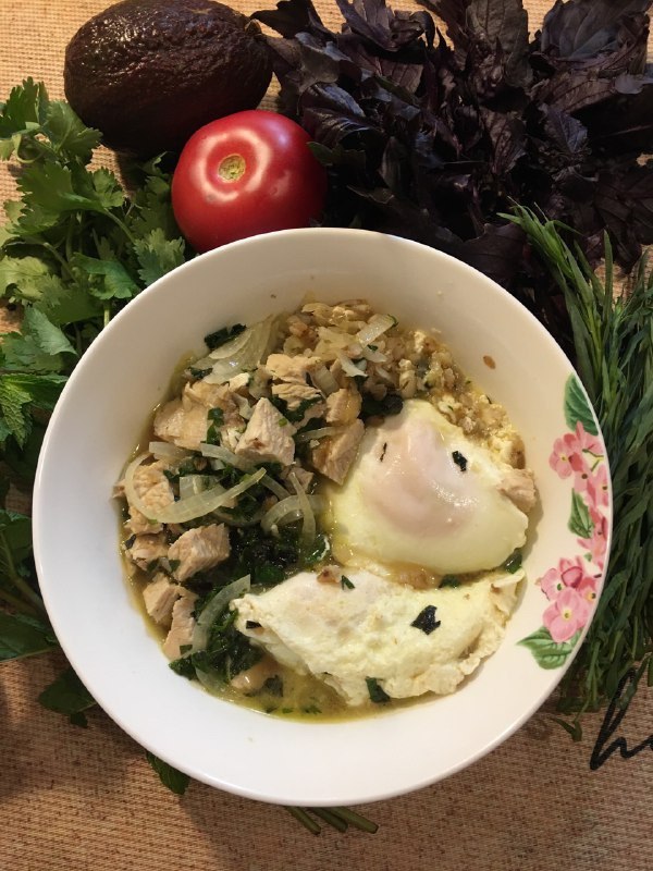 Я накрошил тархун, мяту, зеленый базилик и кинзу на горячую сковородку с маслом ГХИ, залил сверху яйцами и перевернул через 5 минут.