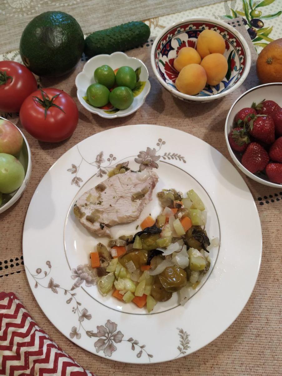 Алыча, индейка, баклажаны, кабачки, морковь, тархун, мята, базилик, томленые в духовке.