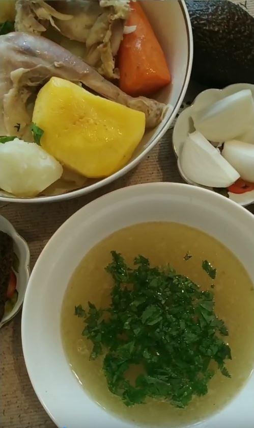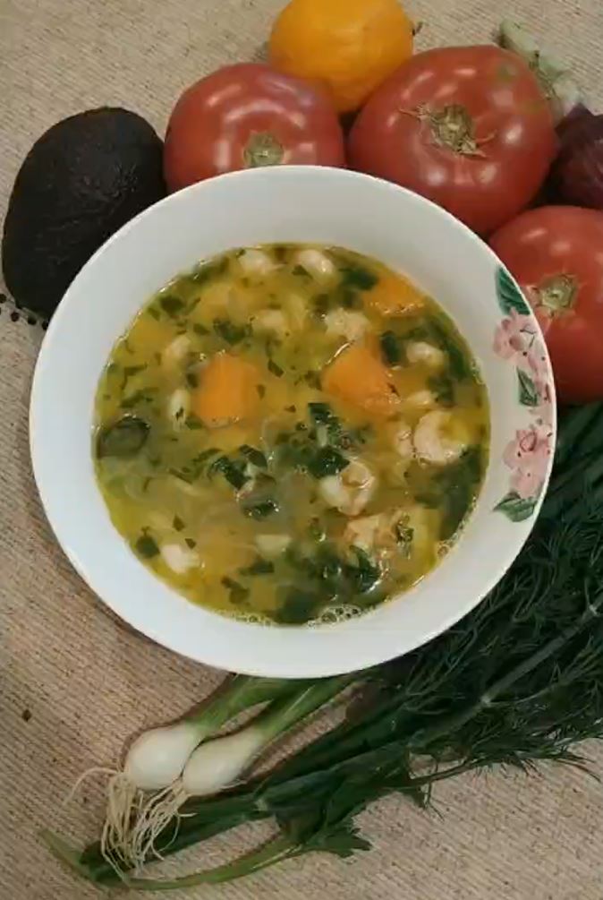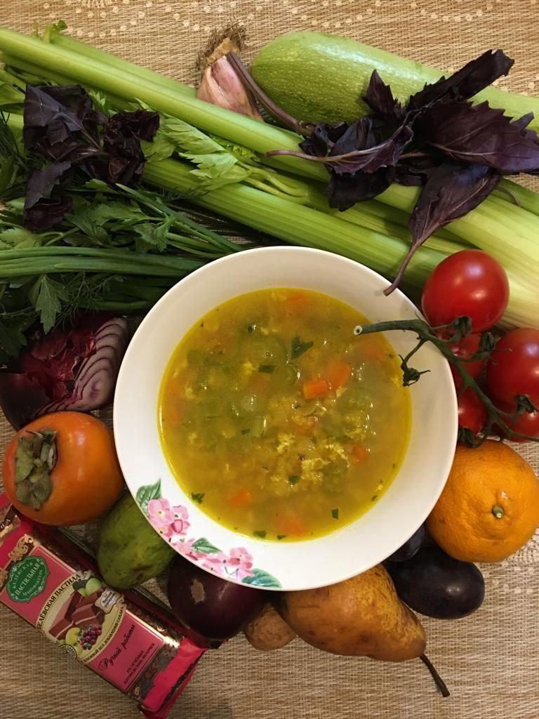 Суп из краснодарского сельдерея на курином бульоне с сезонными овощами и пряностями.