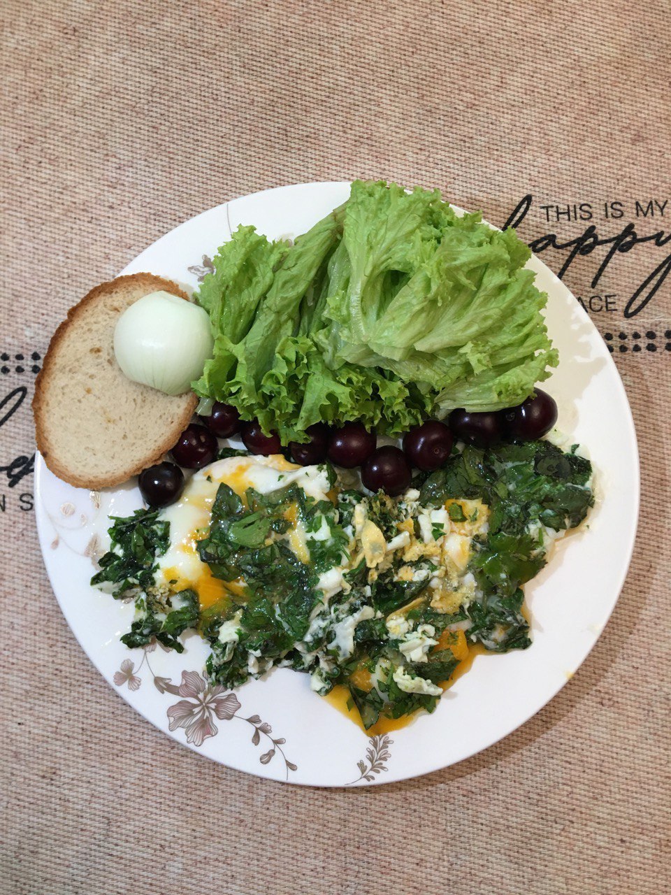– остаток салатного листа, несколько черешен и половину сочной хрусткой луковицы с подовым хлебом.