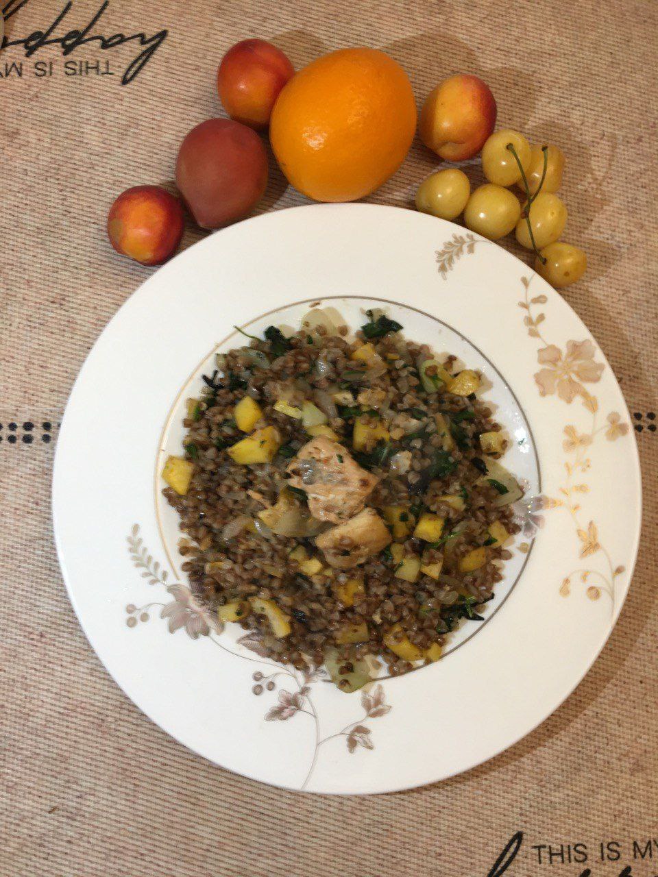 Соте из репы, бланшированной зелени и гречки с кусочками жареной горбуши