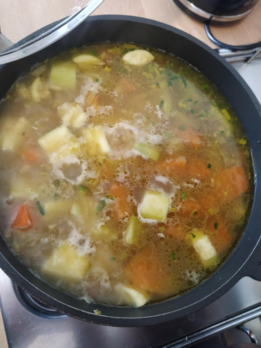 Хитрости: В суп перед духовкой добавить 4 урюка и горсть красной турецкой чечевицы с булгуром для бульона. Перед подачей в тарелку немного соевого соуса вместо соли. Получается очень вкусно!