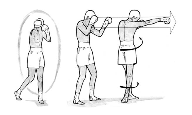 При ударе вся сила направлена от корпуса, и при возвращении руки в исходное положение она идет расслабленной, без траты энергии. В положении, когда рука вытянута вперед, левое плечо должно прикрывать подбородок слева, а правый кулак – подбородок справа или спереди.