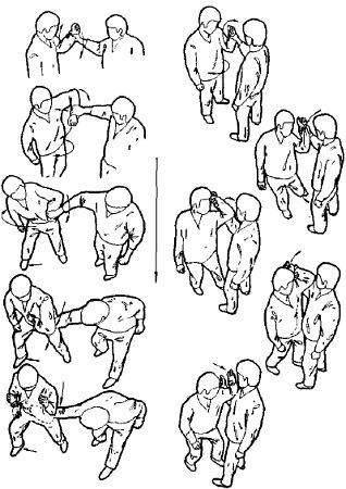 Техника выполнения более подробно будет описана в следующих номерах, но, в основном, это комбинации вышеописанных приемов защиты с приемами выбивания по кисти.