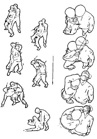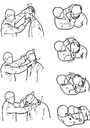 Все фазы приема показаны на рис. 27. Левой рукой сзади сверху берем противника за голову, правой рукой снизу за подбородок. Работа идет в трех направлениях: левой рукой тянем влево, правой рукой вправо, одновременно вытягивая шейные позвонки (они же – ось вращения) по вектору силы. Подсаживаясь, делаем работу во всех трех направлениях.