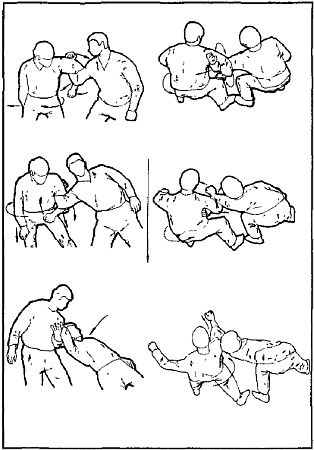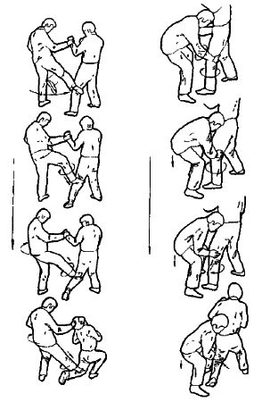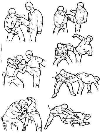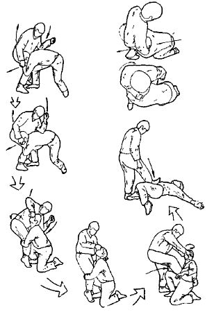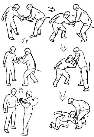 После этого можно провести кует приемов: либо скрутка головы, либо удары, либо переход на болевые приемы и удержания. Кстати, можно не допустить захвата ног встречным ударом снизу в лицо. Но если противник захватил одной рукой, допустим, левое колено, то отшагивая правой ногой назад, накладываем правую руку на внутреннюю поверхность правого предплечья противника. Теперь, используя его захват как точку вращения, скручиваем его тело по ходу движения, при этом используем как рычаг его выпрямленную правую руку, поворачивая его справа налево.