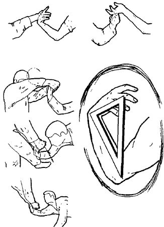 В основном, применяется в работе с кистью (рис. 24). При сгибании сустава болевой эффект в суставной сумке начинается, когда угол между костями становиться меньше прямого. Наибольший болевой эффект будет в плоскости прямоугольного треугольника, где в прямом угле находится сустав запястья, а в остром – локтевой сустав.