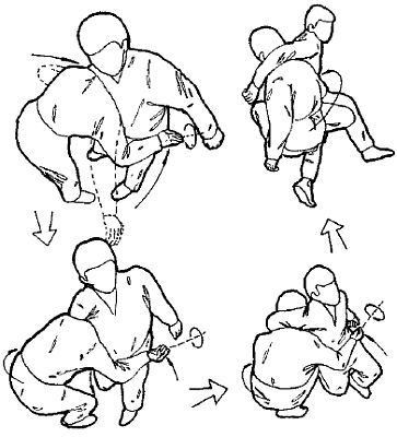– при захвате из подмышки за шею спереди накладываете левую руку на подколенный сустав, а правую на грудь, плечо или «подвздошную» кость. Затем применяете пару сил и, вкручивая кисти, совершаете вращательное движение вокруг вертикальной оси, скручиваетесь и садитесь вниз;