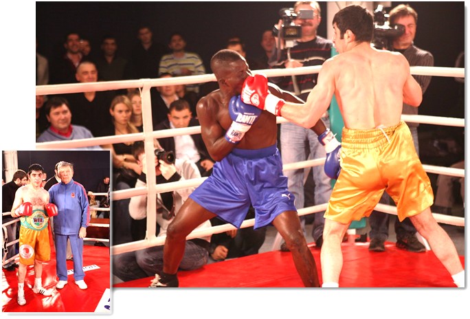 2008-11-28. Москва. Проф.бокс (промоутер А. Шкаликов). WBL. Арман Саргсян (Россия) vs Абдул Джабир (Гана). На фото слева стоят: А. Саргсян, ЗТР по боксу В. П. Смоляков