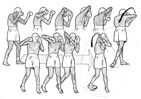 Также важно, что голову защищает и высоко поднятое плечо, и плечевой сустав бьющей руки – между головой и плечом не должно оставаться открытого места, куда может быть нанесен встречный удар.