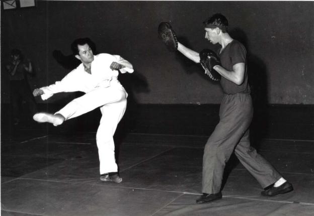 1989. Тренер С.Заяшников показывает удар ногой с разворота "уро-маваши-гери".