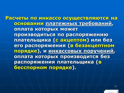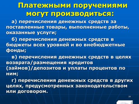 1. денежные расчеты путем перевода денежных средств со счета плательщика на счет получателя