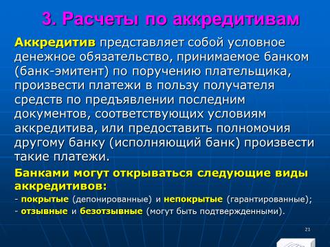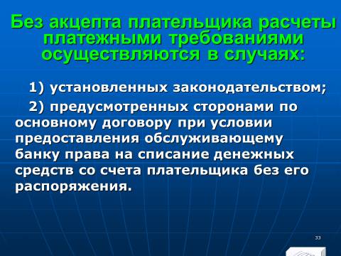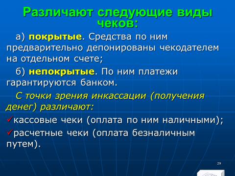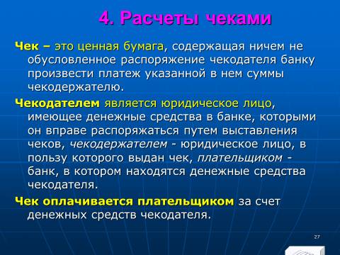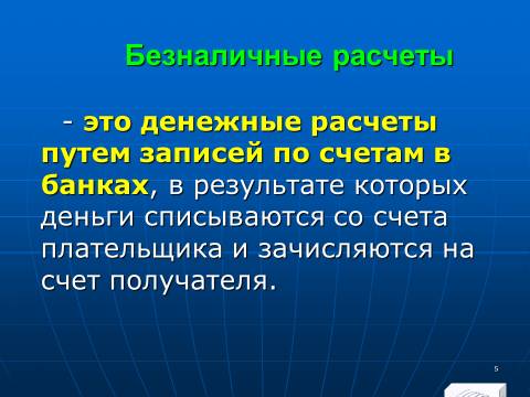 4. денежные расчеты путем выставления чеков, векселей и аккредитивов в банках, в результате которых деньги списываются со счета плательщика и зачисляются на счет получателя