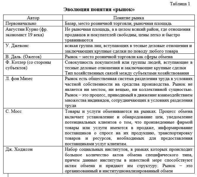 Рынок – обязательный компонент товарищеского хозяйства. По словам Н.И. Бухарина, рынок – это обратная сторона товарного производства, основа рыночного хозяйства (табл. 1).