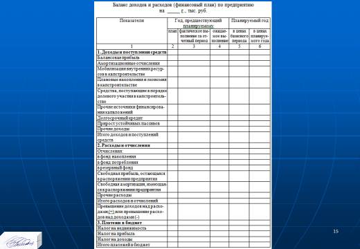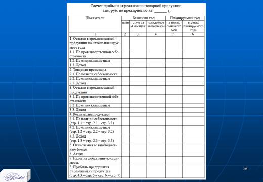 5. основной финансовый документ, отражающий весь объем активов и пассивов предприятия в планируемом периоде (форма №1 «Бухгалтерский баланс»).