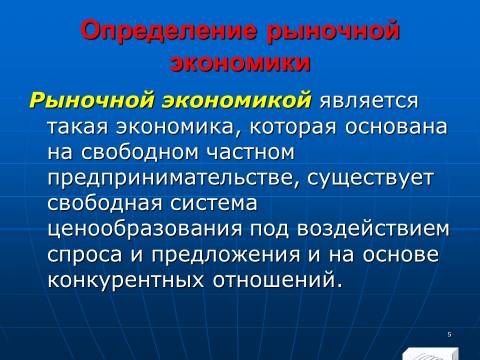 1. Рыночной экономикой является такая экономика, которая основана на свободном частном предпринимательстве, где существует свободная система ценообразования под воздействием спроса и предложения и на основе конкурентных отношений;