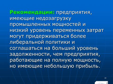 В отличие от производственных запасов и незавершенного производства, которые не могут быть резко изменены, дебиторская задолженность представляет собой весьма вариабельный и динамичный элемент оборотных средств, существенно зависящий от принятой в организации политики в отношении покупателей продукции. Поскольку дебиторская задолженность представляет собой обездвижение собственных оборотных средств, т.е. в принципе она не выгодна организации, то с очевидностью напрашивается вывод о ее максимально возможном сокращении. Дебиторская задолженность может быть сведена до минимума, тем не менее этого не происходит по многим причинам, в том числе и по причине конкуренции.