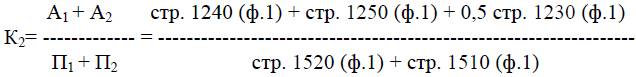К2 показывает, какая часть краткосрочных обязательств организации может быть немедленно погашена за счёт средств на различных счетах, в краткосрочных ценных бумагах, а также поступлений по расчётам.