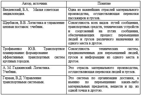 Основой транспортной логистики является транспорт. В научной литературе можно найти разные определения транспорта. Рассмотрим некоторые из них (таблица 1.1).