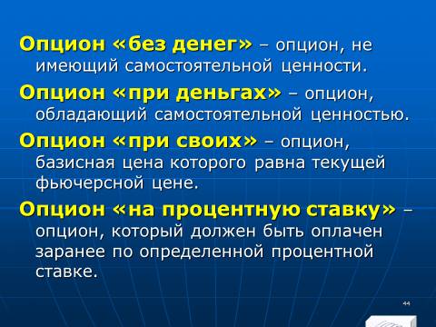 1. опцион, который должен быть оплачен заранее по определенной процентной ставке, не имеющий самостоятельной ценности