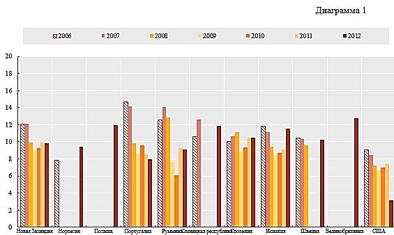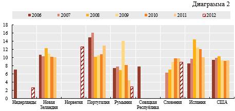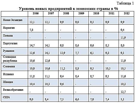 По данным Евростата1, кризисные явления явились причиной снижения количества новых предприятий, и в целом, данная тенденция продолжается. В некоторых странах, таких как Италия, Корея, Португалия и США можно наблюдать снижение предпринимательской активности на треть. При этом практически во всех странах количество новых предприятий в секторе строительства и сфере услуг превышают показатели сферы промышленности и производство, что связано с более низкими первоначальными затратами, связанными с созданием предприятий малого бизнеса. Даже в условиях кризиса во всех странах наибольшее количество стартапов наблюдается от 1 до 4 человек, что связано с возможностью снижения расходов на заработную плату, аренду, а также иных расходов, таких как социальные налоги. При этом в некоторых странах во время мирового кризиса 2008-2009 года не наблюдалось создание новых предприятий, к таким странам относятся, например, Норвегия, Польша, Швеция, Великобритания. Напротив, в условиях стабильности можно констатировать большое развитие новых компаний. Значительные показатели роста открытия новых предприятий можно наблюдать в 2012 году в Польше, Испании, Великобритании.