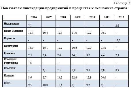 В ряде стран с течением времени можно наблюдать как тенденцию к снижению количества новых компаний, так и тенденцию к снижению ликвидации малых предприятий в период с 2007 по 2010 годы, что свидетельствует о том, что на рынке осуществляют деятельность, в основном стабильные компании, снижаются случаи открытия компаний без инвестиций и фирм-однодневок. Если говорить о количестве ликвидируемых компаний, то коэффициенты, свидетельствующие о количестве ликвидируемых компаний выше в отношении промышленных предприятий. Это обусловлено большими затратами на производственные запасы, обновление машин и оборудования, необходимостью выплаты заработной платы и иными большими расходами. Самые высокие показатели в отношении ликвидации компаний имеют компании численностью от 1 до 4 человек, что обусловлено низкой устойчивостью на рынке, невозможность адаптироваться к кризисным условиям, а также отсутствием финансовых ресурсов, достаточных для того, чтобы пережить кризисные явления в экономике. Ликвидация компаний является неотъемлемой частью феномена предпринимательской деятельности, связанного с экономическими циклами. При этом данные о ликвидации компаний обычно могут быть несколько недостоверными, поскольку компания может числиться в реестре, вместе с тем в компании могут отсутствовать сотрудники, и может не вестись никакая деятельность, но при этом фактически компания будет существовать. Некоторые учредители, предприниматели в течение двух лет после ликвидации компании предпринимают попытки возобновления ведения бизнеса, открывают новые предприятия, ведущие аналогичный вид деятельности, что непосредственно влияет на другой показатель – показатель создания компаний. Таким образом, показатели создания и ликвидации компаний взаимоувязаны, на ликвидацию компаний большое влияние оказывают такие факторы как инфляция, налоговая и бюджетная политика, которые меняются с течением времени.