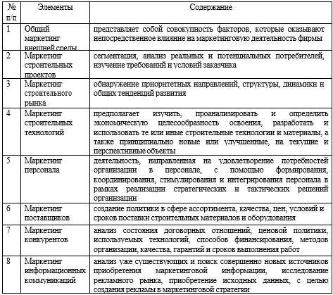 В строительной фирме организацию маркетинга следует разделить на внешнюю и внутреннюю. В строительной компании необходимо выделить перечень структурных элементов внешнего (таблица 1.2) и внутреннего (таблица 1.3) маркетинга.