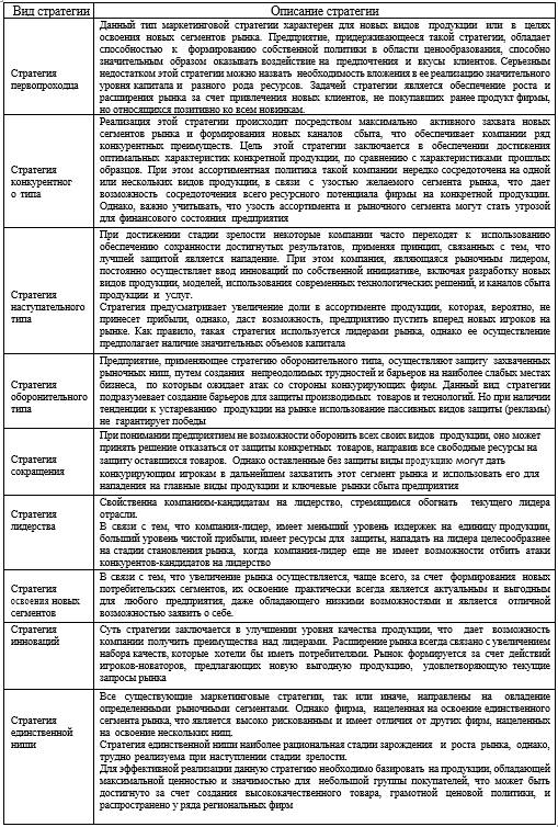 Таблица 1.1 – Характеристика ключевых стратегий маркетинга с точки зрения поведения фирмы на рынке