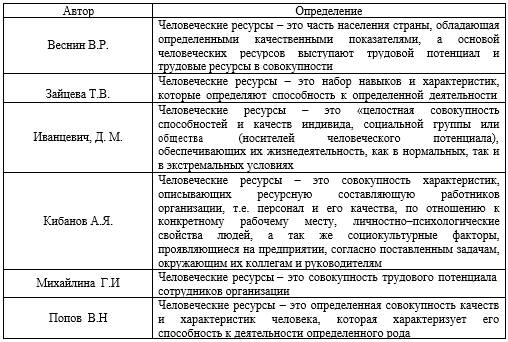 Для того, чтобы определить особенности понятия «человеческие ресурсы» рассмотрим в таблице 1.1 обзор взглядов на дефиницию данного термина в трактовке разных авторов.