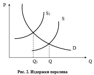 Кривая предложения S отражает лишь индивидуальные издержки, которые финансирует фирма-производитель. Издержки же, отражаемые кривой S включают как индивидуальные издержки, так и внешние. Следовательно, индивидуальные издержки меньше общественных затрат. Производители принимают решение о объеме производства на основе заниженных затрат. Соответственно, равновесная величина продукта Q больше оптимальной величины Q1.