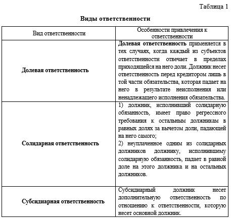 Различают также долевую, солидарную и субсидиарную ответственность.