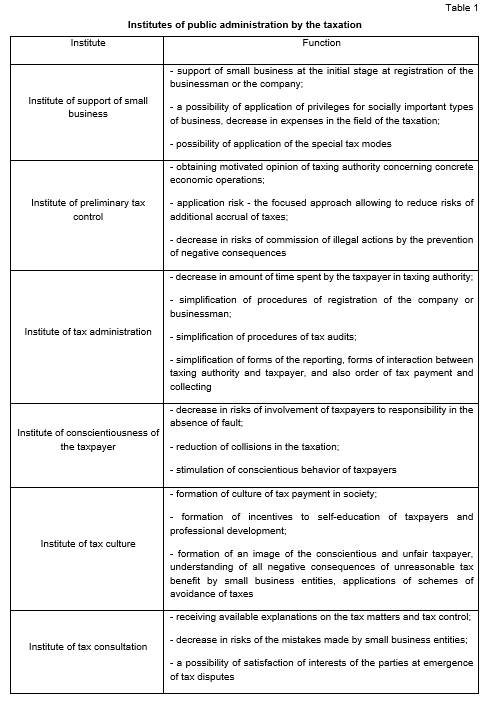 As practically worldwide the institute of tax administration is given great value, in the Russian Federation this institute also has to develop dynamically within institutional approach. Among noticeable measures for improvement of institute of tax administration it is possible to call introduction of electronic document flow, introduction of new services, such as a private office of the taxpayer, introduction of a possibility of obtaining information on contractors online, such as certificates of incorporation. At the same time, the institute of tax administration is subject to further improvement by technological development, decrease in administrative load of small business and the microenterprises, simplifications of system of submission of the reporting. Besides, according to the strategy of development of small and average business in the Russian Federation for the period till 2030 predictable fiscal policy has to gain great value. The predictable fiscal policy based on stability of system of the taxation not introduction of additional non-tax obligations and the additional charges in territorial subjects of the federation will allow to increase coefficient of "birth rate" of small business entities.