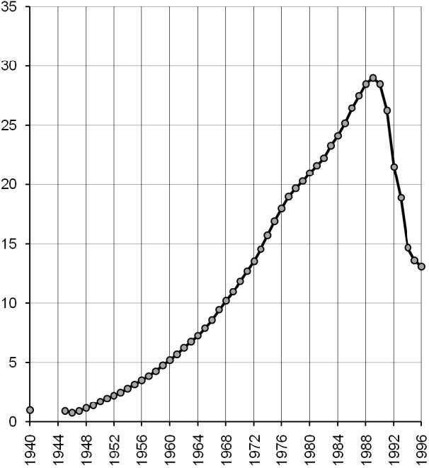 Рис 1. Индексы объема производства промышленности СССР и СНГ (1940 = 1)