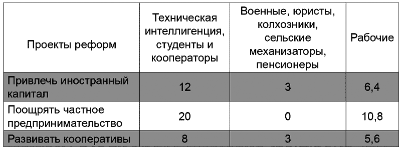 Мы видим, что идею привлечь иностранный капитал поддержала очень небольшая доля граждан, в некоторых крупных социальных группах никто не поддержал[7]. Но даже в авангарде перестройки (интеллигенция, студенты и кооператоры) положительное отношение выразили только 12 % [25, с. 77].