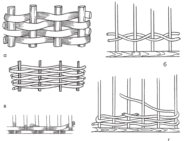 Рис. 1. Плетенка в один прут: а – общий вид; б – схема выполнения; в – закрепление нового прута с обратной стороны стойки; г – присоединение нового прута