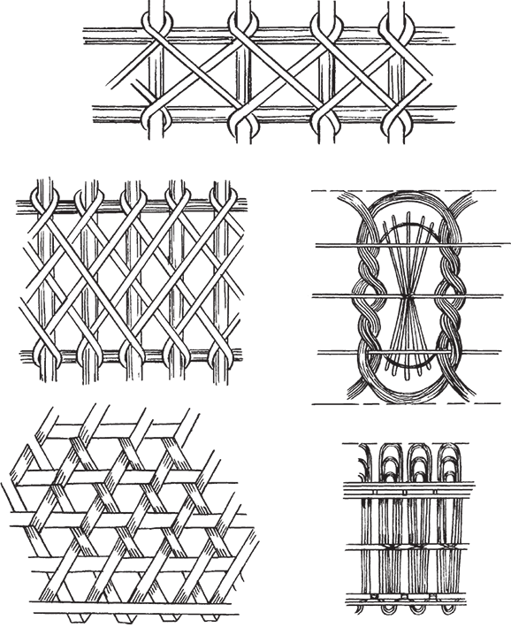 При изготовлении плетеной мебели стоячки могут крепиться к палкам каркаса следующими способами (рис. 16):