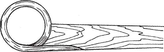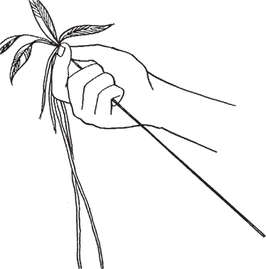 Кора снимается в направлении от верха к комлевой части. Острым ножом выполните аккуратный надрез по всей длине, двигаясь от комля к верхушке. Не надавливайте на инструмент, иначе можно повредить слои древесины, расположенные под корой. Теперь на расстоянии 0,25 длины прута вылущите белый стержень из коры. Поместите палец между корой и стеблем и сдвиньте прут в сторону верхнего конца. После этого в процессе лущения двигайтесь в сторону комлевой части.
