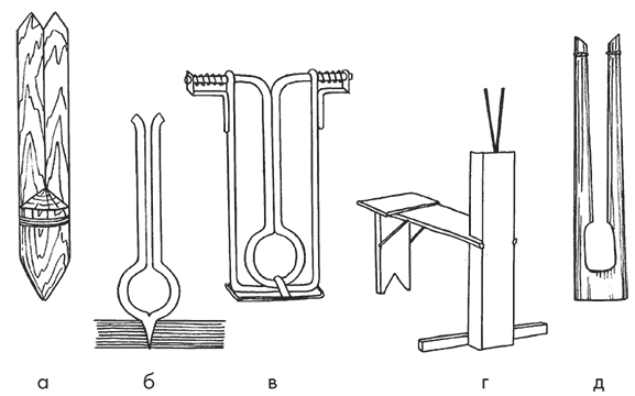 Рис. 21. Щемилки: а – деревянная; б, в – металлическая; г – щемилка-станок; д – деревянная с проволочной прокладкой
